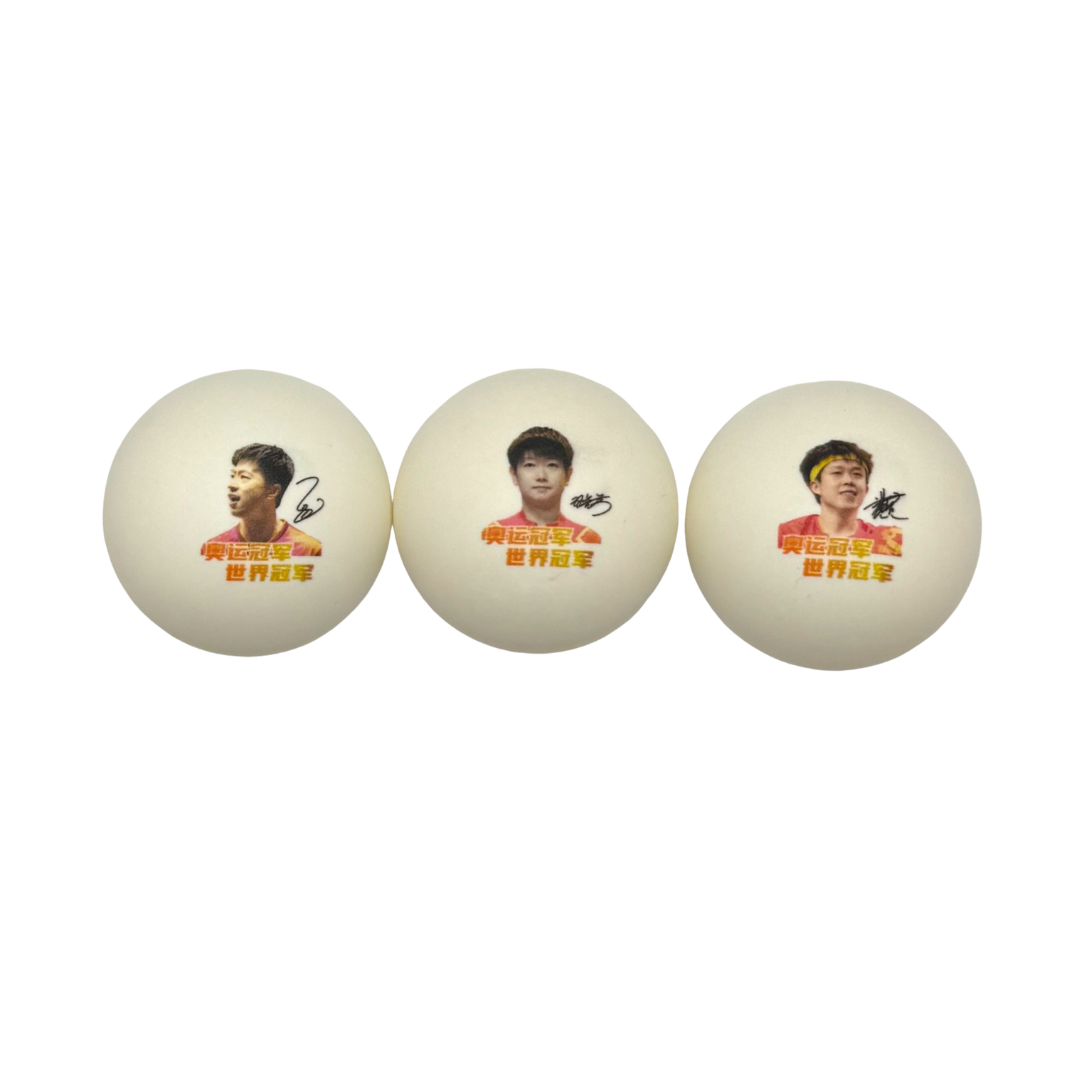 Star Player's Portrait Balls, featuring table tennis icons Ma Long, Sun Yingsha, and Wang Chuqin. Each ball displays a player’s portrait and signature on the front, with the DHS red logo on the back. In addition to being a collectible item, it can also be used as a recreational training ball for casual play and practice.