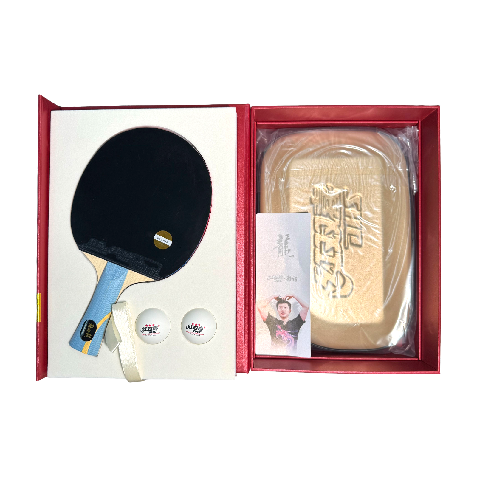 DHS Golden Grand Slam Ma Long Classic Series Table Tennis Racket Set is a professional pre-assembled racket designed to deliver the balanced power, control, and touch that define Ma Long’s legendary playing style. Built with the Hurricane Long 5 blade, this racket features a 5+2 AC construction. It is equipped with Hurricane 3 Blue Sponge and Hurricane 3 rubbers, renowned for its strong tackiness, explosive spin, and penetrating arc, allowing players to generate heavy topspin and precise placement with full confidence. Together, this racket combination mirrors Ma Long’s classic forehand-dominant attack with a reliable, speed-oriented backhand.